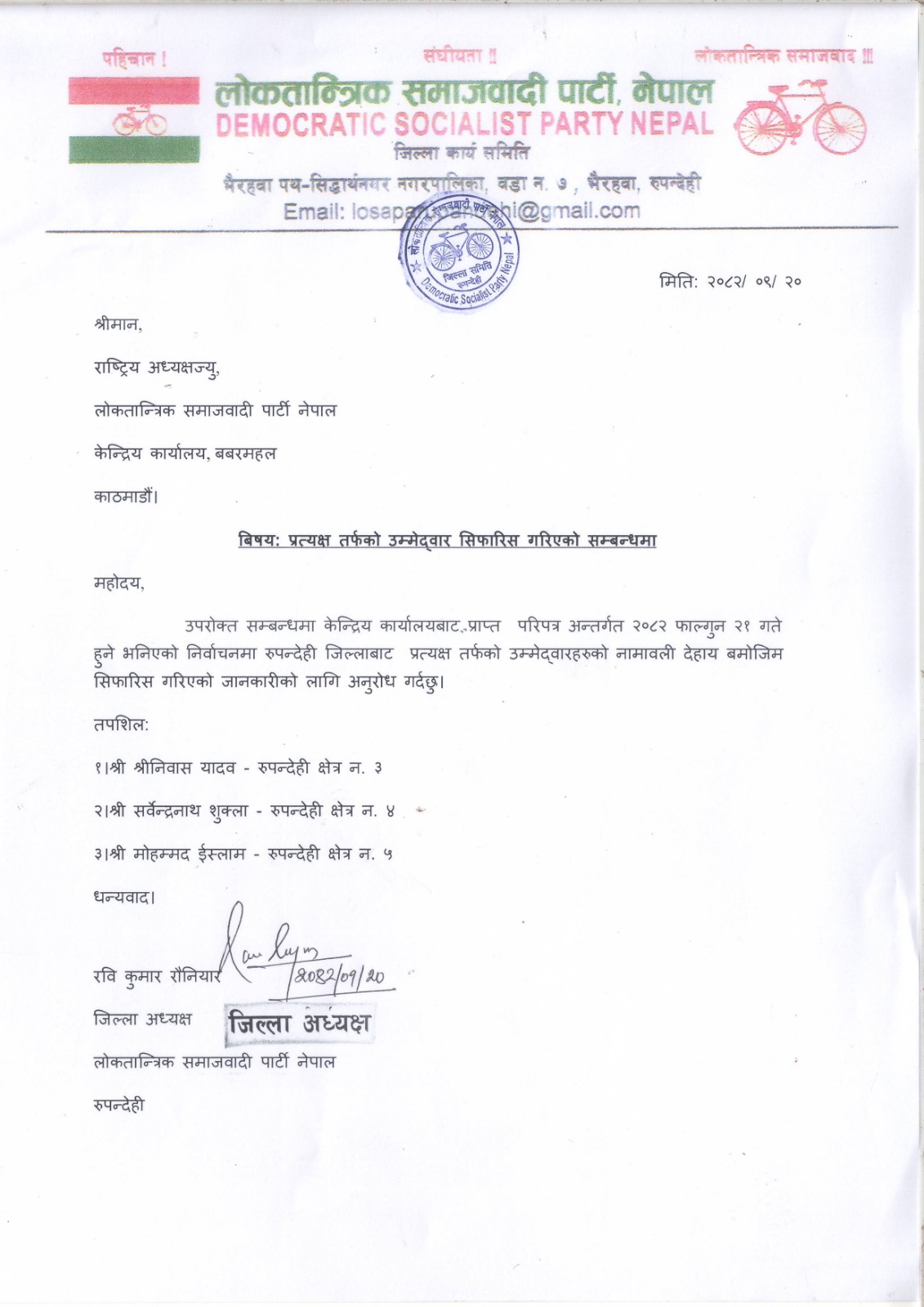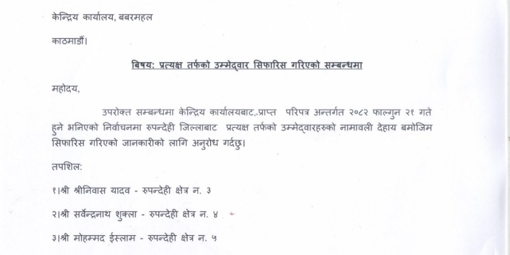 भैरहवा, पुस २१ लोकतान्त्रिक समाजवादी पार्टी नेपाल (लोसपा) ले रुपन्देही जिल्लाबाट हुने आगामी निर्वाचनका लागि प्रत्यक्षतर्फका उम्मेदवार सिफारिस गरेको छ। पार्टीको केन्द्रीय कार्यालयबाट प्राप्त परिपत्रअनुसार २०८२ फाल्गुन २१ गते हुने भनिएको निर्वाचनका लागि जिल्ला कार्य समिति रुपन्दे..