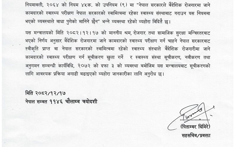 काठमाण्डाै,चैत १७ श्रम, रोजगार तथा सामाजिक सुरक्षा मन्त्रालयले वैदेशिक रोजगारीमा जाने श्रमिकको स्वास्थ्य परीक्षण गर्न मान्यता प्राप्त स्वास्थ्य संस्थाका लागि सूचीकरण खुला गर्ने निर्णय गरेको छ । मन्त्री दीपककुमार साहले मन्त्रिस्तरीय निर्णय गर्दै वैदेशिक रोजगारीमा जाने श्रमिकको स..