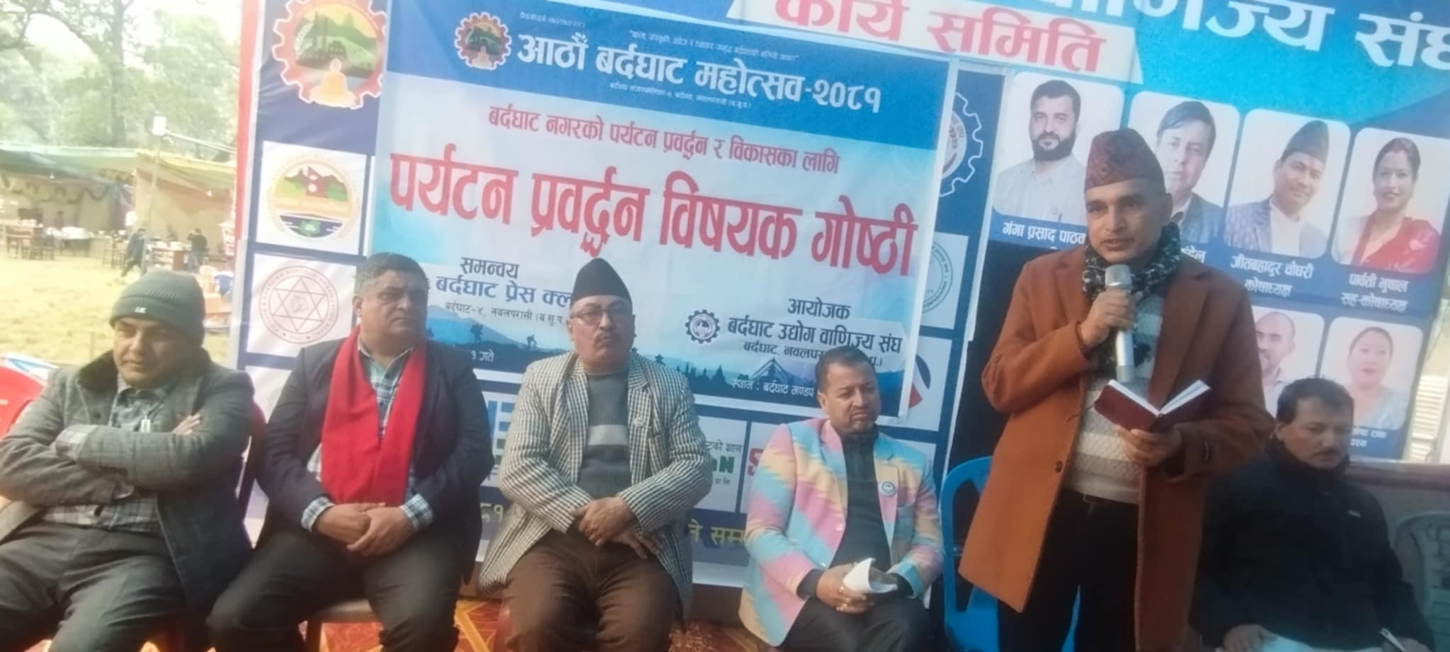 बर्दघाट नगरको बिकासमा पर्यटन क्षेत्रलाई जोड्न माग गरेका छन । बर्दघाट उद्योग बाणिज्य संघको आयोजना र बर्दघाट प्रेस क्लब समन्वयमा बर्दघाटमा पहिलो पटक भएको पर्यटन प्रवर्द्धन बिषयक कार्यक्रममा बोल्दै सरोकारवालाहरुले नगरको बिकासमा पर्यटन क्षेत्रलाई जोड्न दिनु पर्ने आवश्यकता औल्याएका छ्न ।