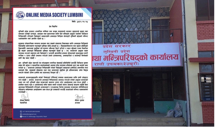 लुम्बिनी प्रदेश सरकारले समाचार सामग्री उत्पादन, प्रकाशन तथा प्रसारणका लागि दिने अनुदान रकममा विभेद गरिएको भन्दै अनलाइन मिडिया सोसाइटी लुम्बिनी प्रदेशले आपत्ति जनाएको छ । प्रदेश सरकारले अनलाइन मिडियालाई मासिक एक हजार रुपैयाँ अनुदान रकम उपलब्ध गराउने निर्णयले राहतभन्दा बढी अपमानित हुनु परेको सोसाइटीले जनाएको छ ।