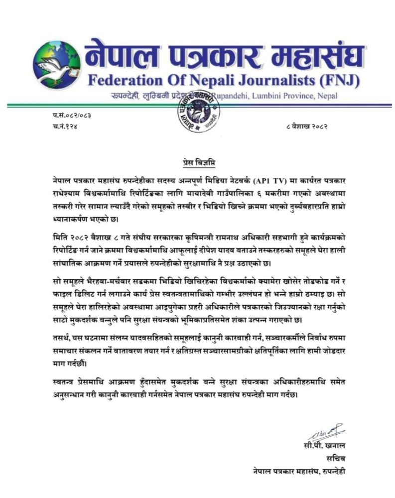 नेपाल पत्रकार महासंघ, रुपन्देही शाखाले पत्रकार राधेश्याम विश्वकर्मामाथि आक्रमण प्रयास गर्ने तस्करहरुको समूहलाई कारबाहीको माग गरेको छ । महासंघका सदस्य तथा अन्नपूर्ण मिडिया नेटवर्क (एपीवान टिभी) मा कार्यरत पत्रकार विश्वकर्मामाथि रिपोर्टिङका लागि मर्चवार जाने क्रममा मायादेवी गाउँपालिका ६, मकरीमा तस्करी गरेर सामान ल्याउँदै गरेको समूहको तस्वीर र भिडियो खिच्ने क्रममा दुव्र्यवहार र आक्रमण प्रयास भएको थियो ।