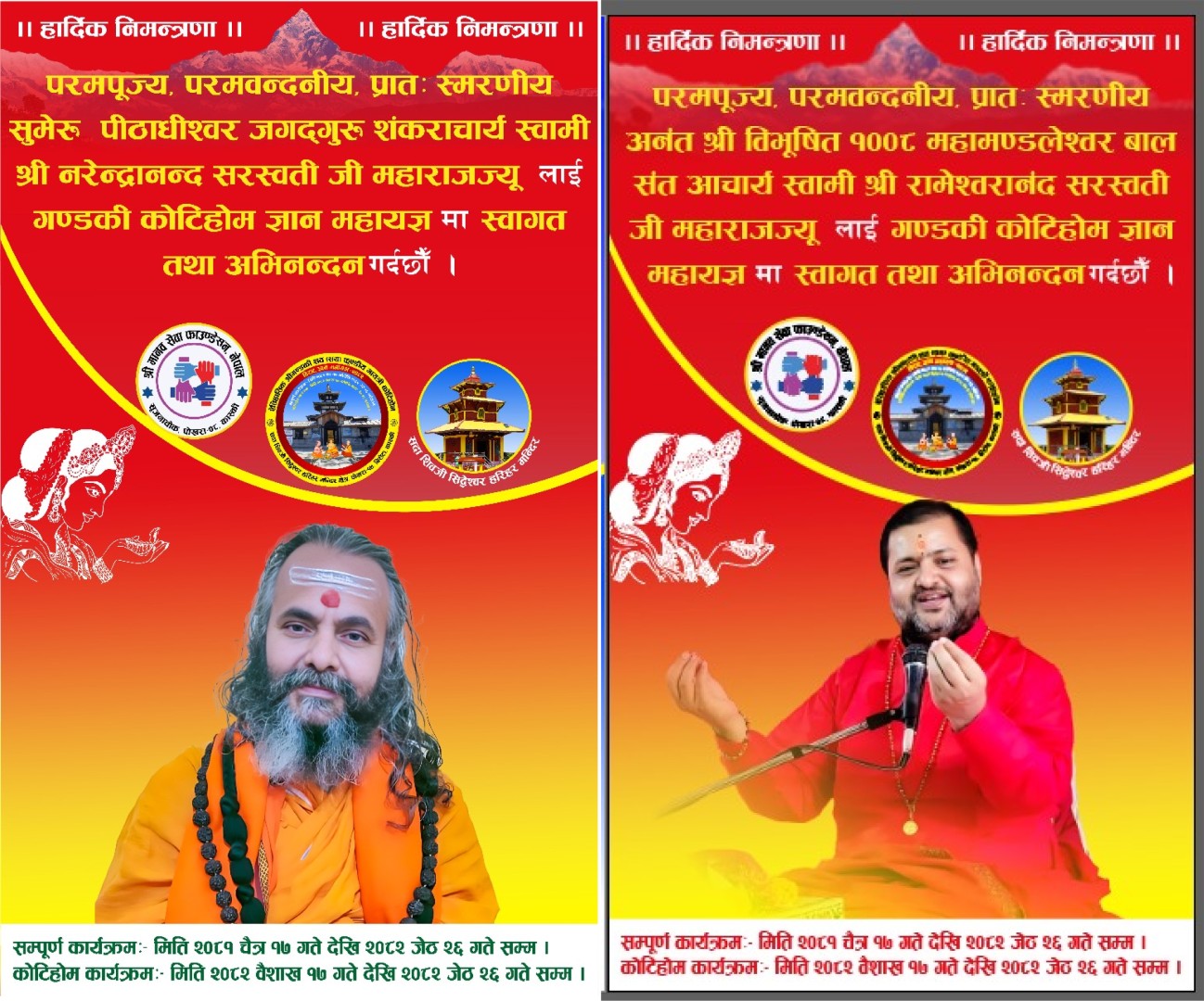 पोखरामा जारी श्री गण्डकी शतकुण्डीय गायत्री कोटिहोम विराट ज्ञान महायज्ञमा भोलि (शनिवार) भारतबाट सन्तहरूको आगमन हुदैछ । कोटिहोममा भोलि सुमेरु पीठाधीश्वर जगद्गुरु शङ्कराचार्य स्वामी श्री नरेन्द्रानन्द सरस्वती जी महाराज र अनन्त श्री विभूषित १००८ महामण्डलेश्वर वाल सन्त आचार्य स्वामी रामेश्वरानंद सरस्वती जी महारज आउने प्रचार प्रसार संयोजक लेखराज ढकालले जानकारी दिनु भएको छ ।