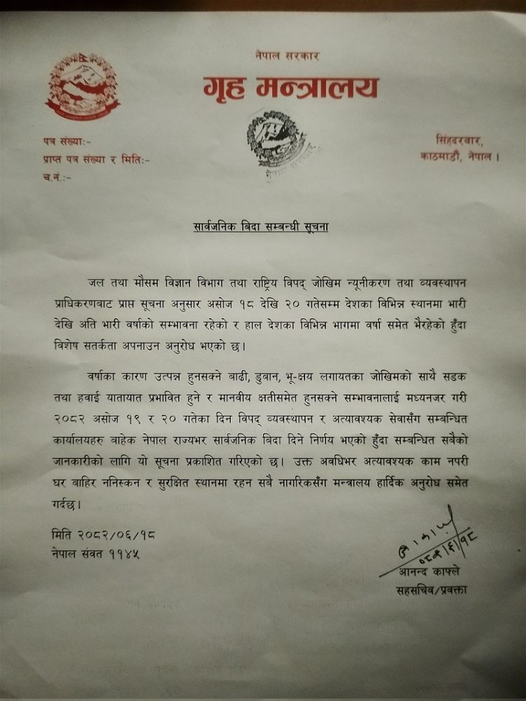 वर्षाका कारण हुनसक्ने बाढी, डुबान, भू–क्षय लगायतका जोखिम एवम् सडक तथा हवाई यातायात प्रभावित हुनसक्ने र मानवीय क्षतिसमेत हुन सक्ने भन्दै सार्वजनिक विदा दिएको मन्त्रालयले आज निकालेको सूचनामा उल्लेख छ । विपद् व्यवस्थापन र अत्यावश्यक सेवासँग सम्बन्धित कार्यालयहरु भने खुल्ला नै रहनेछ । साथै, देशका विभिन्न ठाउँमा ठूलो पानी परिरहेकाले विशेष सतर्कता अपनाउन पनि सरकारले अनुरोध गरेको छ । विदाको समयमा अत्यावश्यक काम नपरी यात्रामा ननिस्कन र सुरक्षित ठाउँमा बस्न आम नागरिकलाई सरकारले आग्रह गरेको छ ।