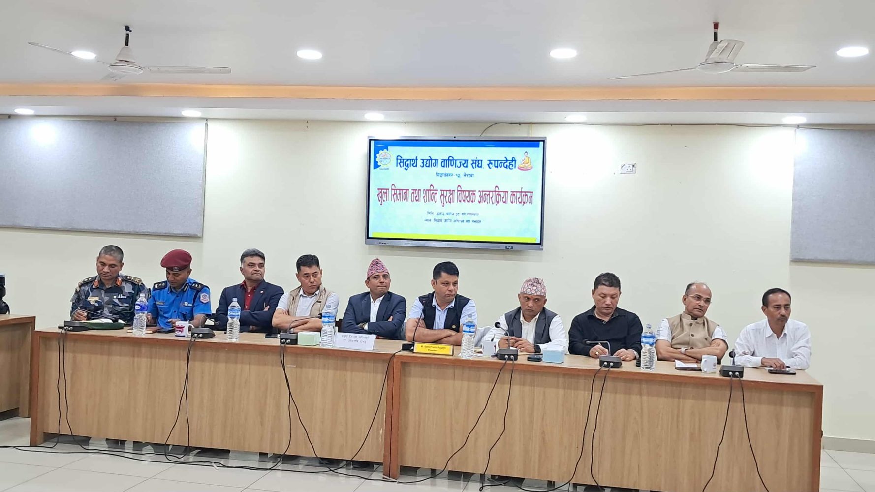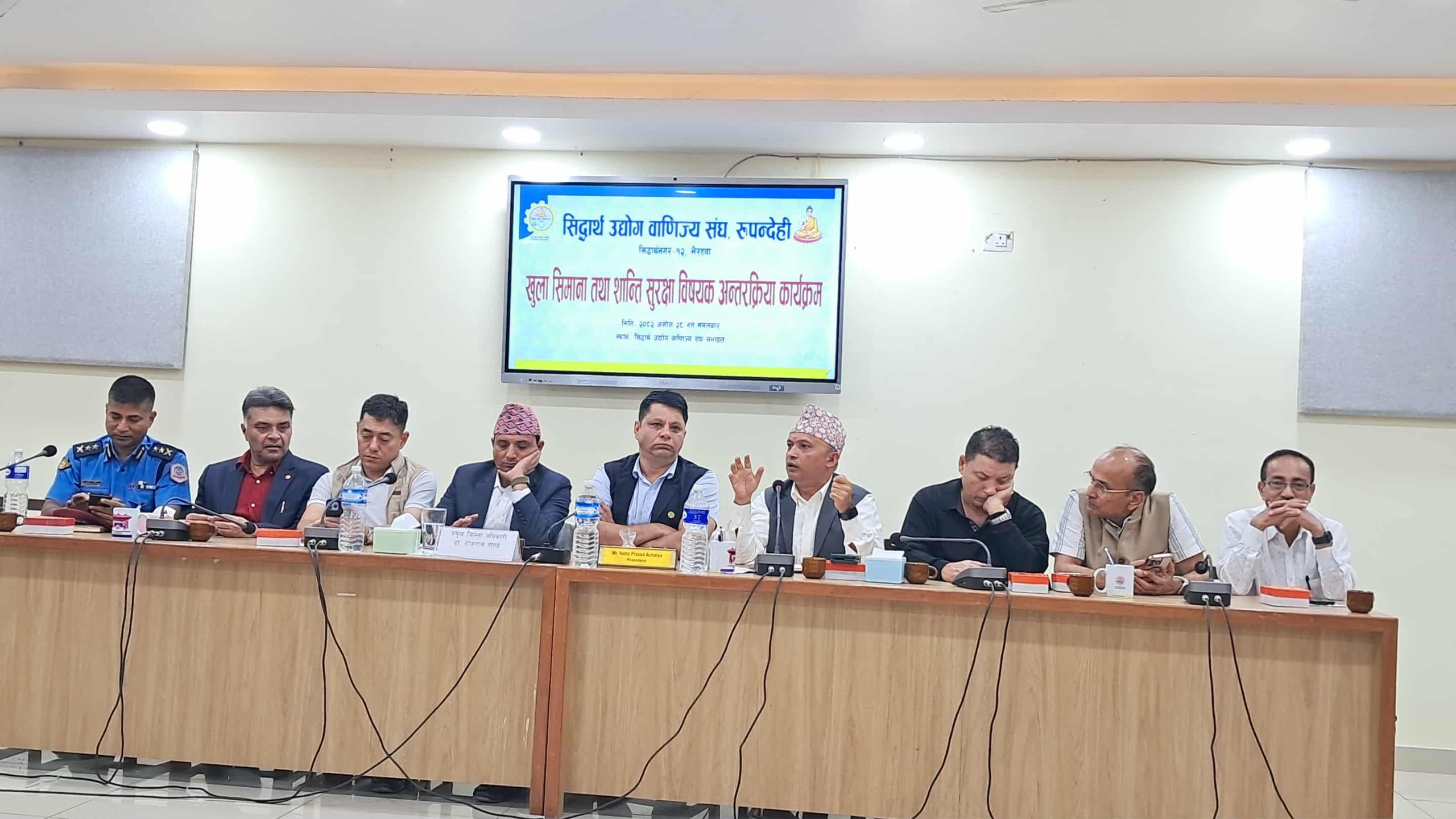 त्यसैगरी कार्यक्रममा सिद्धार्थ उद्योग वाणिज्य संघ रुपन्देहीका अध्यक्ष नेत्र प्रसाद आचार्यले स्थानीय बजारको संरक्षण, स्वदेशी उत्पादनको प्रवद्र्धन र शान्ति सुरक्षाका लागि सबै पक्ष एकजुट हुनुपर्नेमा जोड दिनुभएको छ । उहाँले उद्योगी ब्यवसायी र ब्यापारीहरुको लक्ष्य प्रतिस्पर्धा नभइ स्वदेशी बजारलाई सुदृढ बनाउनु भएकोले भारतीय बजारमा हुने अनियन्त्रित किनमेल रोक्न प्रशासनको निर्णय स्वागतयोग्य भएको जोड दिनु भयो । उहाले भैरहवा–रुपन्देहीका व्यवसायीहरू लामो समयदेखि सीमा पारको हाटबजारबाट प्रभावित हुँदै आएको समेत बताउनुभयो ।