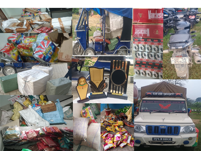जिल्ला प्रहरी कार्यालय रुपन्देहीबाट खटिएको टोलीले ओमसतिया–४ र रोहिणी–१ र २ क्षेत्रबाट बलेरो पिकअप, ई–रिक्सा, मोटरसाइकलसहित ट्रफि,मायाको चिनो ५४० पिस, Manchester United Kingdom चुरोट ४८८० प्याकेट, Midland चुरोट ९८० प्याकेट, सूट रुमाल ६५५० पिस, मिठाई, किराना सामानहरू बरामद गरेको छ। यसको मूल्य करिब रु. २५ लाख ८३ हजार बराबर रहेको प्रहरीले जनाएको छ।