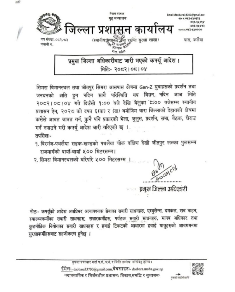 प्रमुख जिल्ला अधिकारी धर्मेन्द्रकुमार मिश्रले जारी गर्नुभएको सूचनामा सिमरा विमानस्थल र आसपासको क्षेत्रमा आज दिउँसो १ बजेदेखि बेलुका ८ बजेसम्म लागू हुने गरी कर्फ्यु लगाएको उल्लेख छ । अहिले पनि सिमरा क्षेत्र तनावग्रस्त छ ।