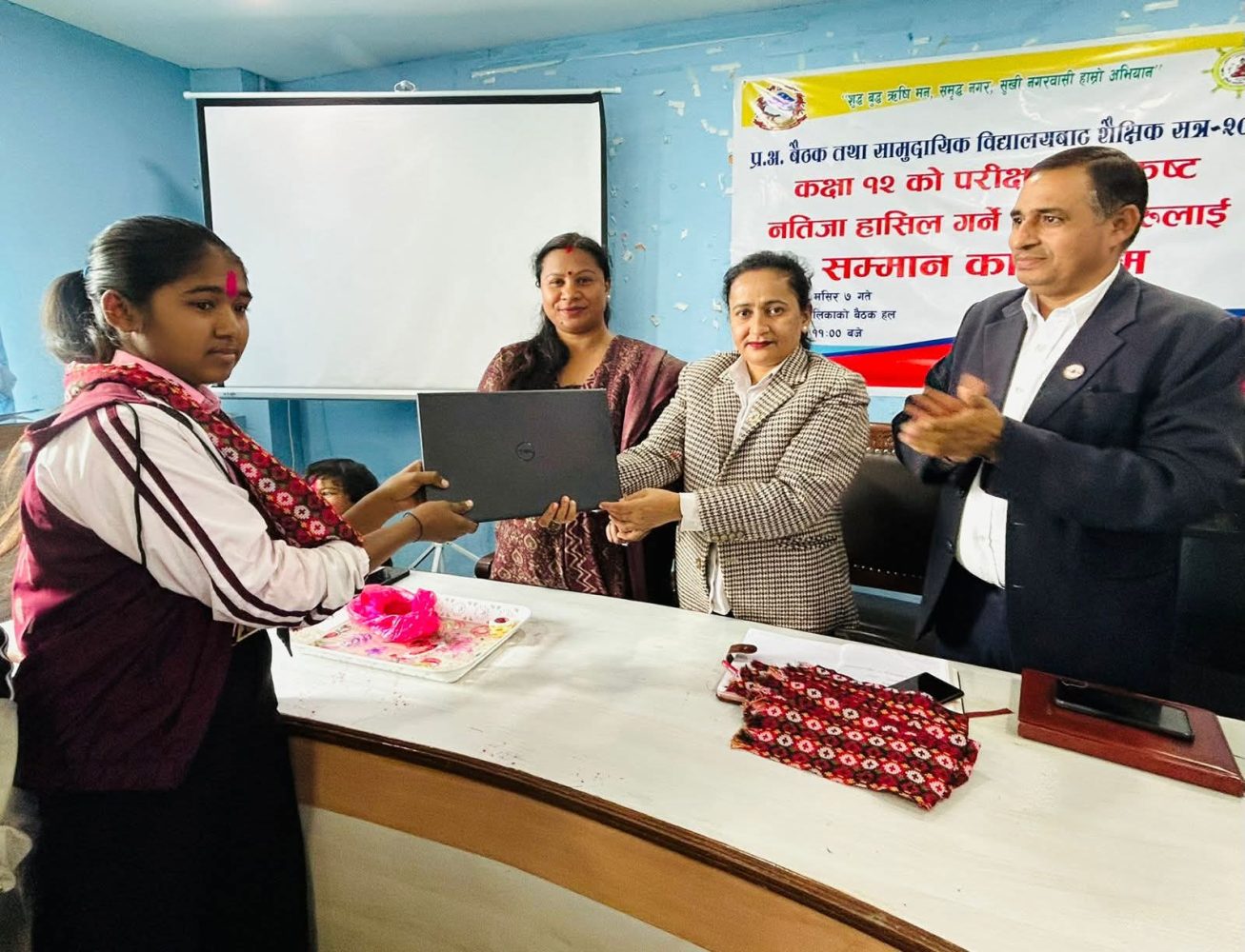 कार्यबाहक नगर प्रमुख कल्पना हरिजनको अध्यक्षतामा भएको कार्यक्रममा शैक्षिक सत्र २०८१ को कक्षा १२ परीक्षामा प्रथम हुने मनिषा कुमारी बनियालाई नगरपालिका द्वारा ल्यापटप प्रदान गरिएको छ। द्वितीय तथा तृतीय श्रेणीमा पर्ने निषा कुमारी यादव, महफुज आलम खान, सगिता यादव र श्रीकृष्ण बरईलाई साइकल प्रदान गरी प्रोत्साहन गरिएको हो।