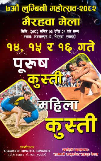 रुपन्देहीको भैरहवामा सञ्चालित सातौं लुम्बिनी महोत्सव–२०८२ (उद्योग, व्यापार, कृषि तथा पर्यटन प्रवद्र्धन) अन्तर्गत मंसिर १४ गतेदेखि कुस्ती प्रतियोगिता हुने भएको छ ।