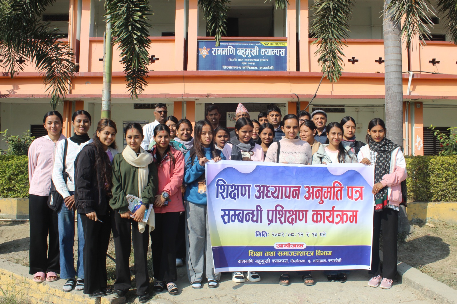 त्यसैगरी, दुई दिने शिक्षण अध्यापन अनुमति पत्र सम्बन्धी दुई तालिम पनि क्याम्पसमा सम्पन्न भएको छ । शिक्षा तथा समाजशास्त्र विभागका प्रमुख मधुसुदन खनालको अध्यक्षतामा आयोजित कार्यक्रमबीच पूर्व सह–सचिव थानेश्वर ज्ञवाली र लुम्बिनी प्रदेश शिक्षा मन्त्रालयका उप–सचिव हरिप्रसाद अर्यालले प्रशिक्षण दिनुभएको थियो ।
