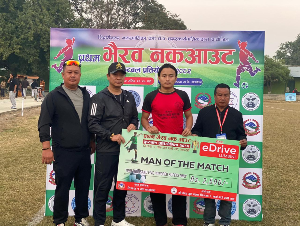 रुपन्देहीको सिद्धार्थनगर नगरपालिका–१ स्थित पक्लिहवा माध्यमिक विद्यालयको खेलमैदानमा जारी ‘प्रथम भैरव नकआउट फुटबल प्रतियोगिता–२०८२’ जारी छ । प्रतियोगिता अन्तर्गत मंगलबार भएको खेलमा भैरव युवा क्लब रामग्राम, नवलपरासी विजयी भएको छ । खेलमा फर्साटिकर युवा क्लव फर्साटिकर, शुद्धोधन रुपन्देहीलाई २–० गोलले पराजित गर्दै भैरव क्लब विजयी भएको हो । खेलमा भैरव क्लबका खेलाडी अनुज गैरेले खेल सुरु भएको १४ औं मिनेटमा पहिलो गोल गर्नुभएको थियो । सोही क्लबका विज्ञान गुरुङले ३० औं मिनेटमा दोस्रो गोल गर्नुभएको थियो ।