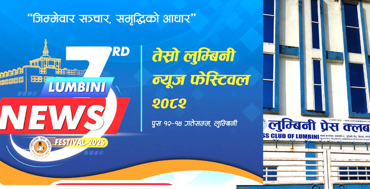 बुद्ध जन्न्मस्थल लुम्बिनीमा आजदेखि लुम्बिनी न्यूज फेस्टिवल शुरु भएको छ । लुम्बिनी प्रेस क्लब, रुपन्देहीको आयोजनामा शनिबार देखि ‘तेस्रो लुम्बिनी न्युज फेस्टिबल’ शुरु भएको हो । शनिबार देखि शुरु भएको लुम्बिनी न्यूज फेस्टिवल पुष १४ गते सकिनेछ । लुम्बिनीस्थित लुम्बिनी बौद्ध विश्वविद्यालयको सभाहलमा आयोजना गरिएको न्युज फेस्टिवलमा पत्रकारिताको प्रबद्र्धन, पत्रकारिताको माध्ययमबाट लुम्बिनीको प्रबद्र्धन र यस क्षेत्रका मुद्दाहरुलाई राष्ट्रिय तथा अन्तर्राष्ट्रियकरण गर्न फेस्टिवल आयोजना गरिएको क्लबका उपाध्यक्ष तथा कार्यक्रम संयोजक दीपेन्द्र बडुवालले जानकारी दिनुभयो ।