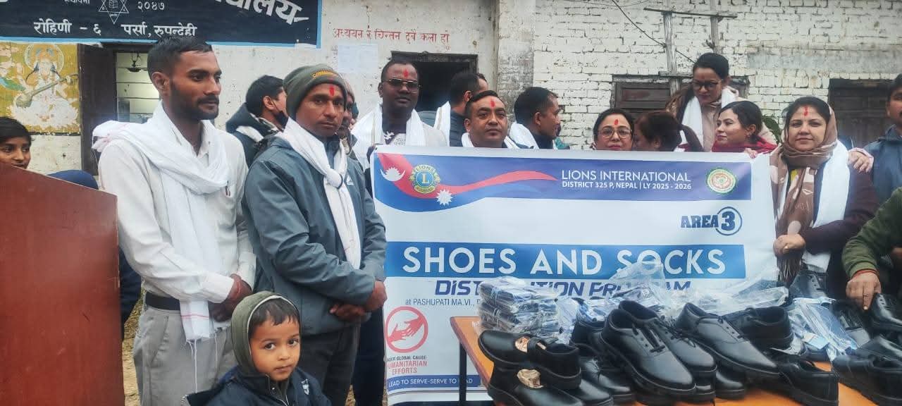 लायन्स क्लब अफ बुटवल हेल्पिङ ह्यान्ड्सले रुपन्देहीको रोहिणी गाउँपालिका–६ पर्सामा रहेको श्री पशुपति माध्यमिक विद्यालयमा अध्ययनरत बाल विकासदेखि कक्षा १० सम्मका ३५० जना विद्यार्थीलाई सोमबार जुत्ता तथा मोजा वितरण गरेको छ। कार्यक्रम विद्यालय व्यवस्थापन समितिका अध्यक्ष नगेन्द्र प्रसाद धवलको अध्यक्षतामा सम्पन्न भएको हो । कार्यक्रममा अध्यक्ष धवलले जाडो मौसममा विद्यार्थीहरूलाई लक्षित गरी गरिएको सहयोग अत्यन्तै सराहनीय रहेको बताउनुभएको छ । उहाँले भन्नुभयो,