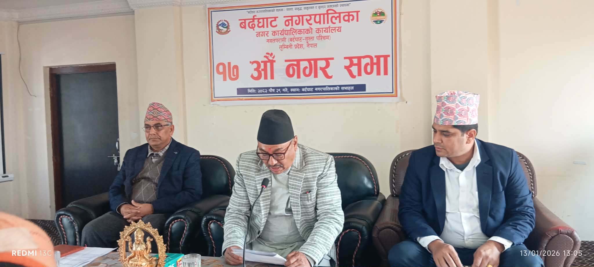 पश्चिम नवलपरासीको बर्दघाट नगरपालिकाको १७औँ हिउँदे नगरसभा मंगलवार बाट सुरु भएको छ। नगर सभामा आर्थिक बर्ष २०८२ काे पहिलाे संसाेधन वमाेजिमकाे संसाेधित वजेट र आय ब्यय पेस गरीएकाे थियाे ।