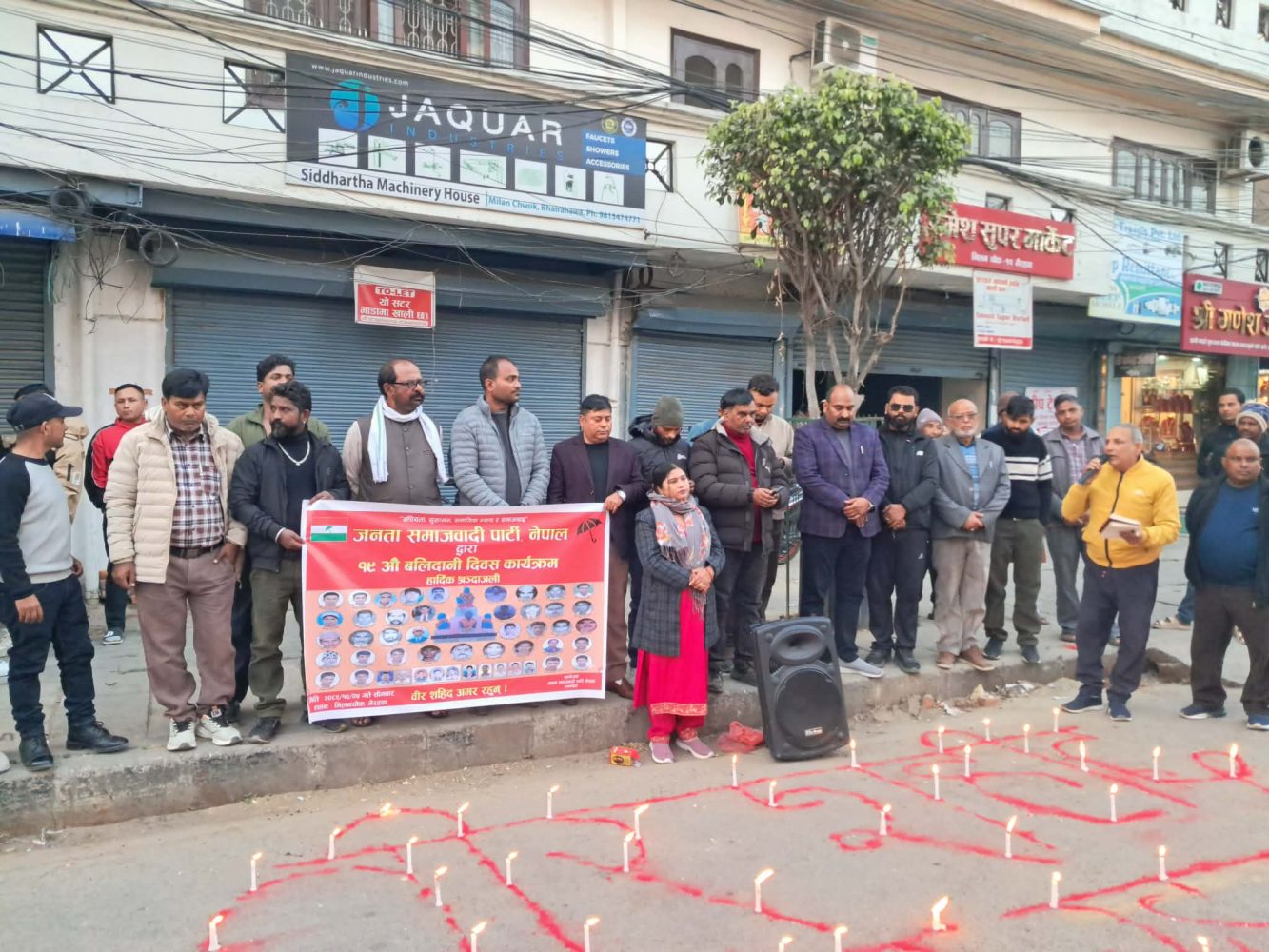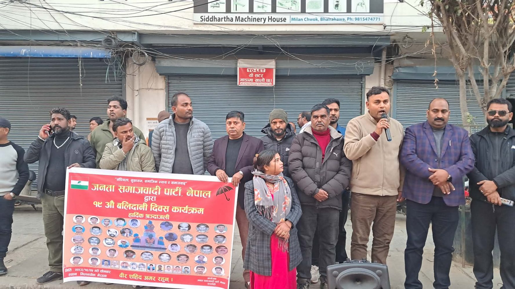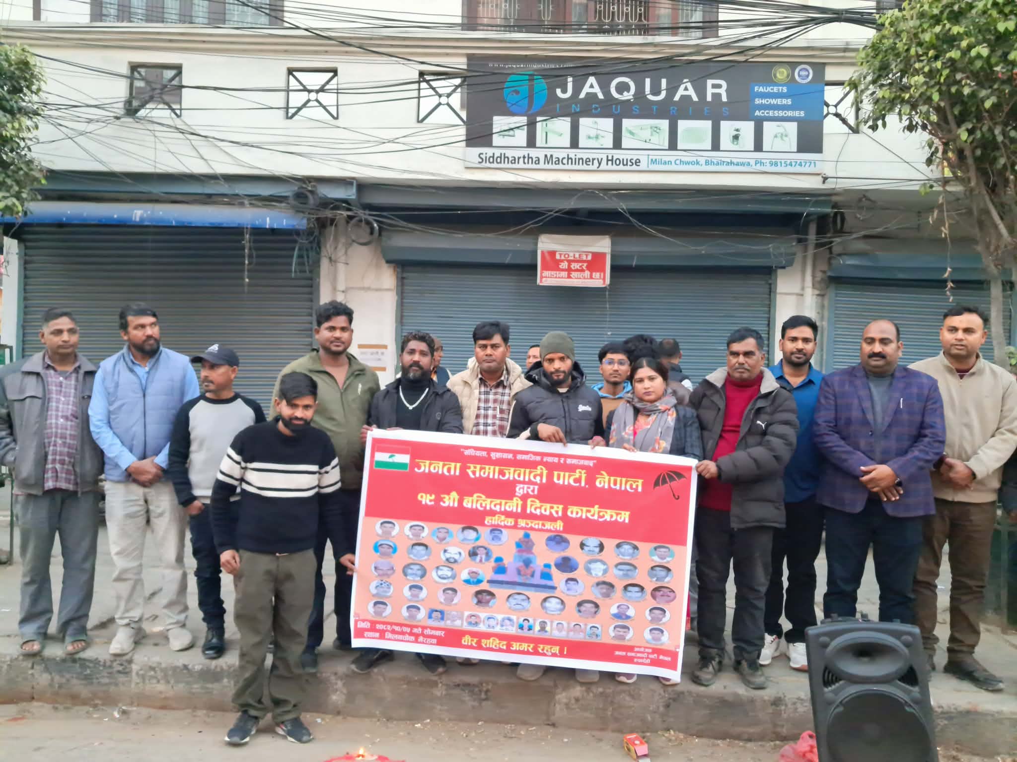 जनता समाजवादी पार्टी (जसपा) नेपाल रुपन्देहीले आज भैरहवाको मिलनचोकमा १९औँ बलिदानी दिवस दिप प्रज्वलन गरी मनाएको छ । बलिदानी दिवस कार्यक्रमलाई सम्बोधन गर्दै जसपा नेपाल लुम्बिनी प्रदेश अध्यक्ष रामअवतार यादवले मधेश आन्दोलनका क्रममा सहिदहरूले देखाएको त्याग र बलिदानकै कारण आज संघीयता, समावेशिता र पहिचानका मुद्दा स्थापित भएको बताउनुभएको छ ।