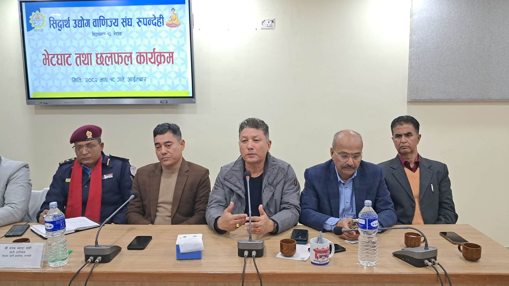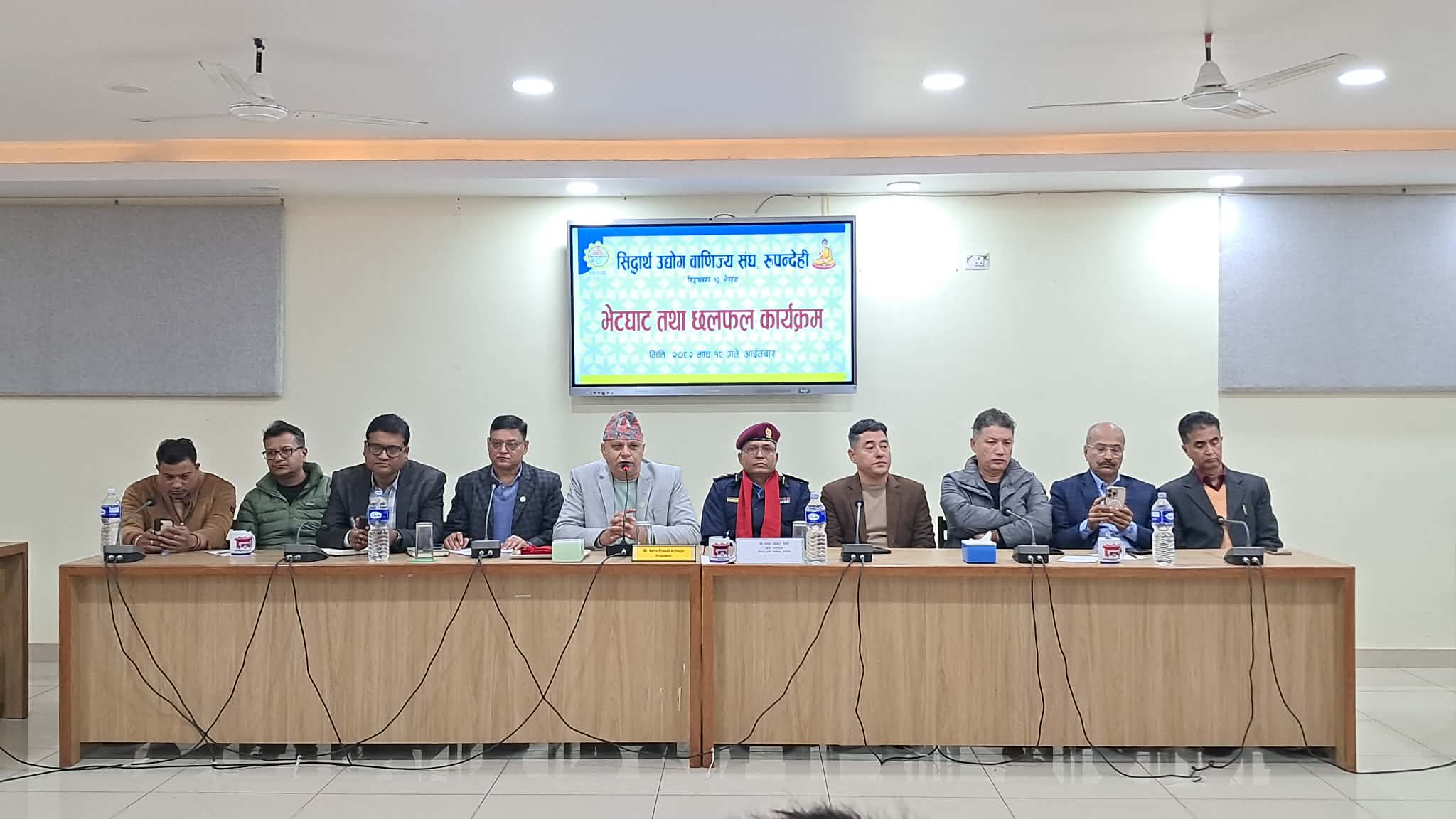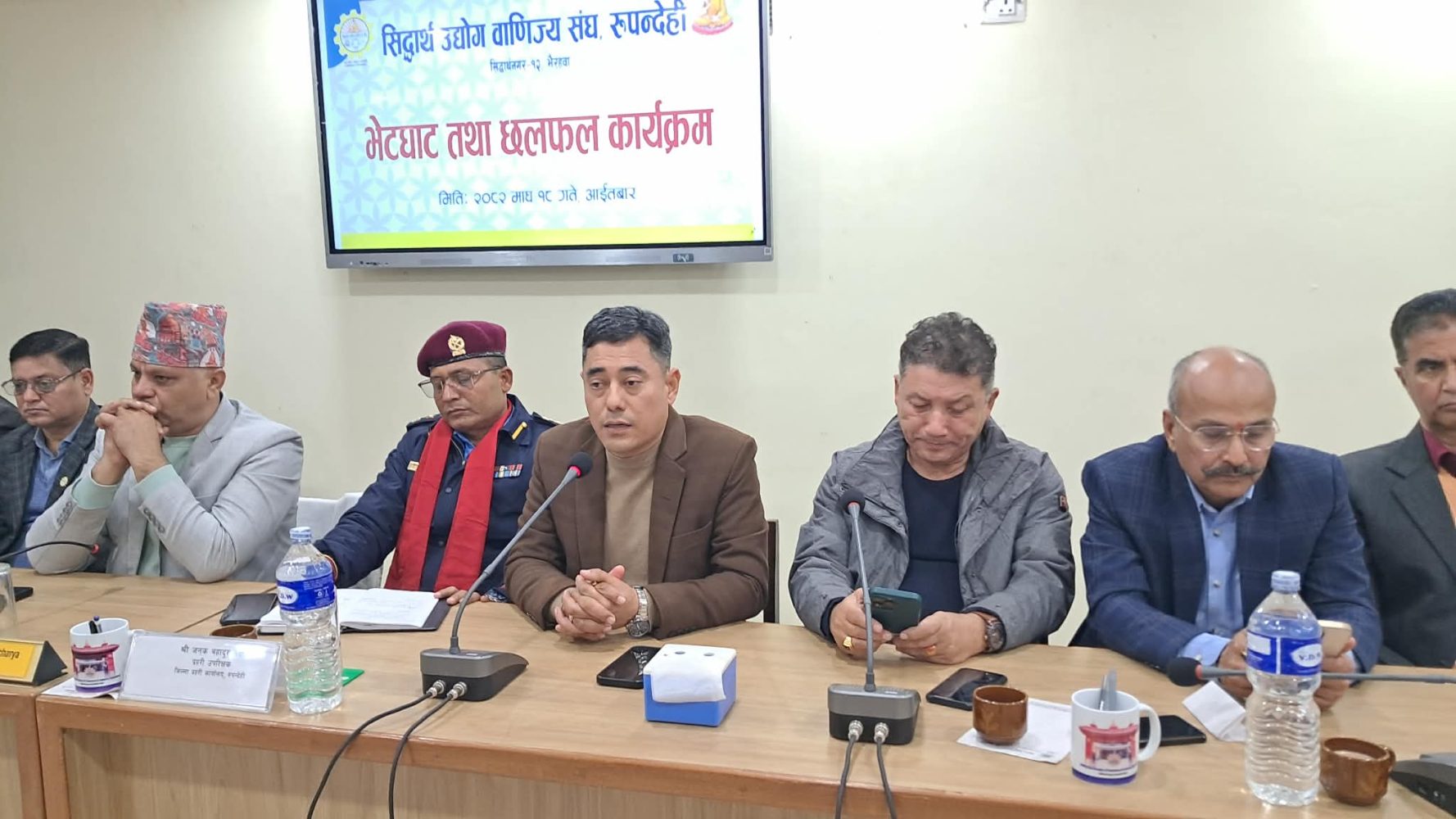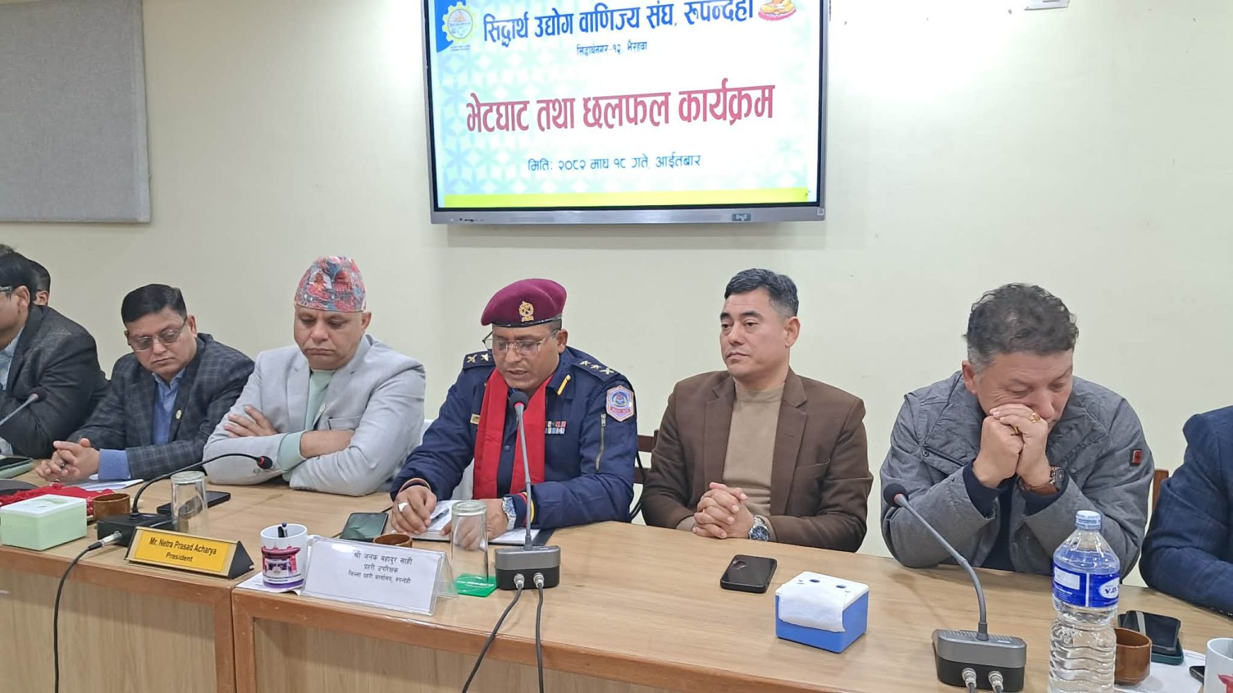 सिद्धार्थ उद्योग वाणिज्य संघ रुपन्देही, सिद्धार्थनगर–१२ भैरहवाले जिल्ला प्रहरी कार्यालय, रुपन्देहीका प्रहरी उपरिक्षक जनक बहादुर शाहीसँग भेटघाट तथा छलफल कार्यक्रम सम्पन्न गरेको छ । रुपन्देहीमा सरुवा भइ आउनु भएको नवनियुक्त प्रहरी प्रमुखलाई आइताबार भैरहहवामा स्वागत गर्दै संघका अध्यक्ष नेत्र प्रसाद आचार्यले खुला सिमाका कारणले गर्दा उद्योग ब्यवसाय संचालन गर्न धेरै चुनौतीहरुको सामना गर्न परिरहेको बताउनु भएको छ । उहाले भारतिय बस्तुसंग नेपाली उत्पादन गरेका बस्तुले प्रतिस्पर्धा गर्न चुनौती रहेको जिकिर गर्र्र्र्र्र्र्दै खुला सिमानाले गर्दा चिनी, लगायत दैनिकी अति आवश्यक पर्ने बस्तुहरु चोरी तस्करी हुदै आएकोले यसलाई निगरानी गरी नियन्त्रण गर्न आग्रह गर्नु भएको छ ।