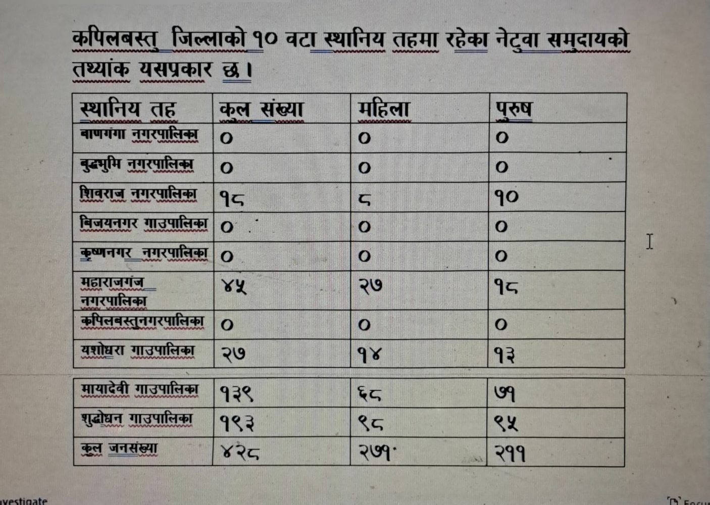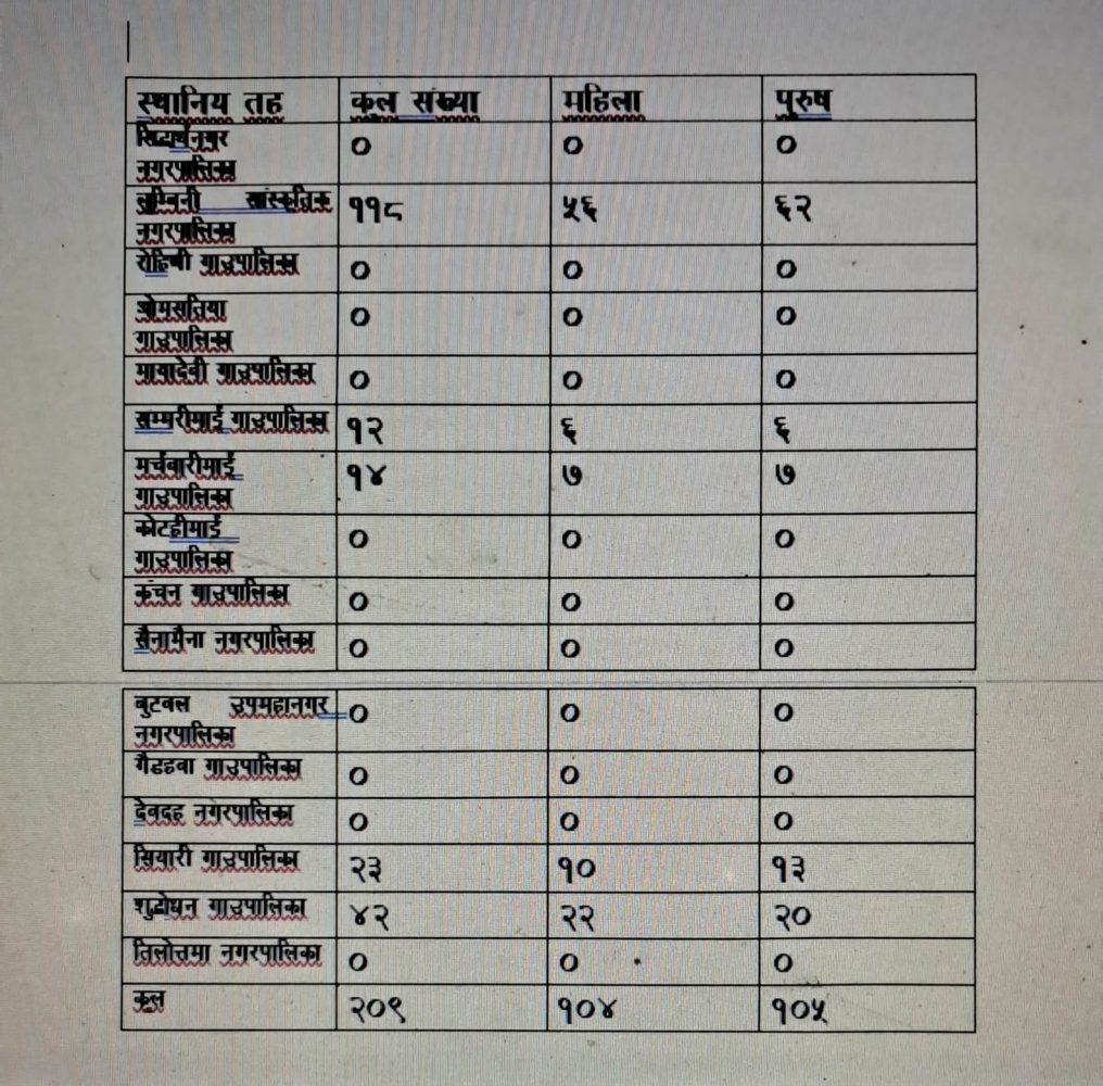 रुपन्देही जिल्लाको १६ वटा स्थानिय तहमा रहेका नेटुवा समुदायको तथ्यांक