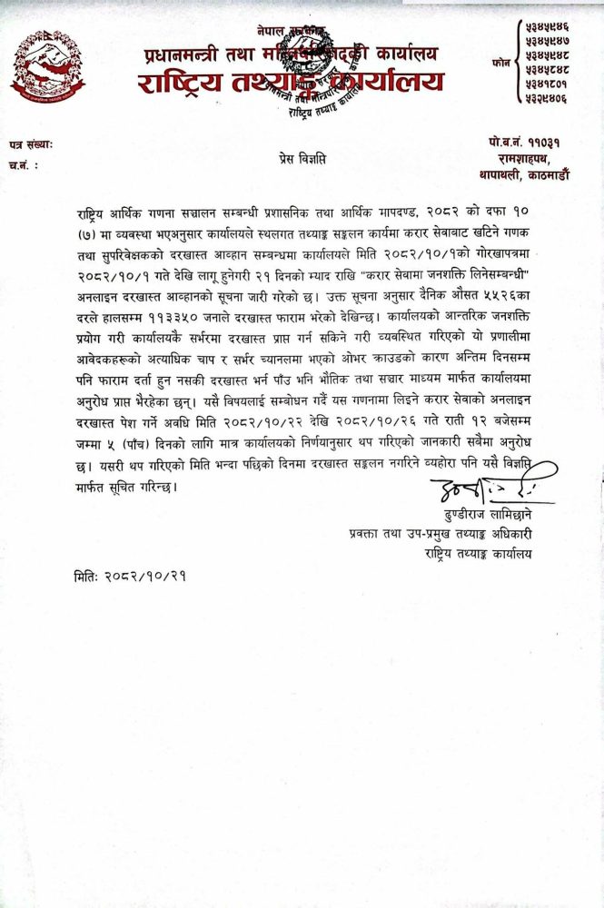 कार्यालयले गत १ माघमा २१ दिनको म्याद दिएर राजपत्र अनंकित प्रथम श्रेणीतर्फ ५२६ तथा राजपत्र अनंकित द्वितीय श्रेणीका लागि तीन हजार ९१३ कर्मचारी माग गरेको थियो। साढे दुई महिनाका लागि खुलाइएको करार सेवाको जागिरमा राजपत्र अनंकित प्रथम श्रेणी पदलाई ३४ हजार सात सय ३० तथा राजपत्र अनंकित द्वितीय श्रेणीका लागि ३२ हजार ९०२ रुपैयाँ मासिक तलब तोकिएको छ। स्थलगत तथ्यांक संकलन र सुपरिवेक्षणका लागि कार्यालयले करारमा कर्मचारी भर्ना गर्न लागेको हो।
