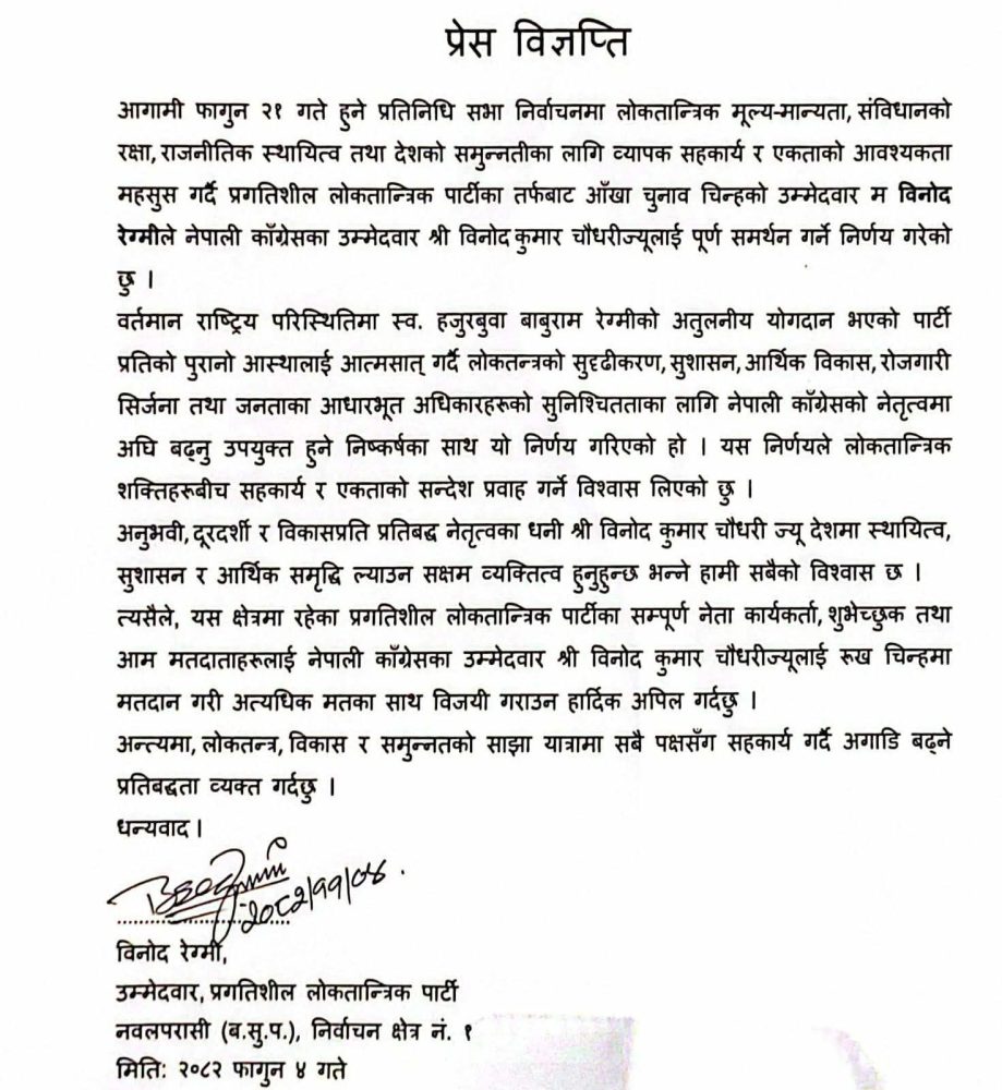 सोमबार एक ‘प्रेस विज्ञप्ती जारि गर्दै आगामी फागुन २१ गते हुने प्रतिनिधि सभा सदस्य निर्वाचनको क्रममा मतदाताको मनोभावनालाई समेत मध्यनजर गर्दै र अहिलेको विषम राष्ट्रिय परिस्थितिलाई ध्यानमा राख्दा मुलुकको राजनीतिक स्थायीत्व र निकासका लागि नेपाली काङ्ग्रेस नै मुलुकको प्रमुख राजनीतिक शक्तिको रुपमा स्थापित हुने पार्टीका रुपमा अनुसरण गर्दै देश, जनता र राष्ट्रप्रति वफादार बन्दै ,आफ्नो हजुरबुवाको समेत आस्था रहेको पार्टी नेपाली काङ्ग्रेसका उमेदवार बिनोद चौधरी लाइ आफ्नो पुर्ण समर्थन रहेको उल्लेख छ।