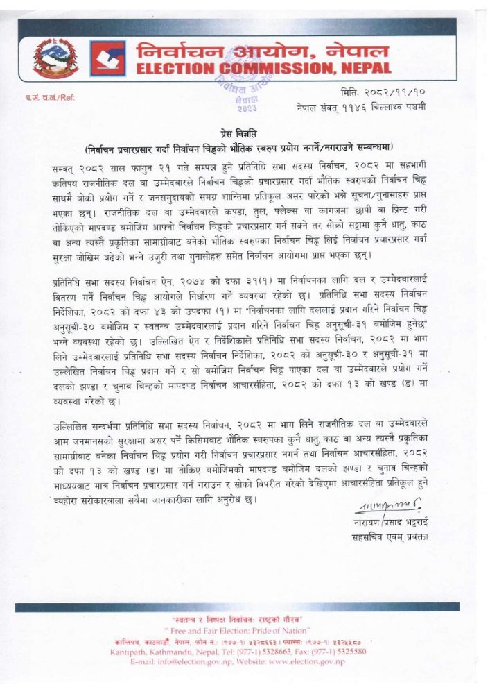 ‘प्रतिनिधिसभा सदस्य निर्वाचन, २०८२ मा भाग लिने राजनीतिक दल वा उम्मेदवारले आम जनमानसको सुरक्षामा असर पर्ने किसिमबाट भौतिक स्वरुपका कुनै धातु, काठ वा अन्य त्यस्तै प्रकृतिका सामाग्रीबाट बनेका निर्वाचन चिह्न प्रयोग गरी निर्वाचन प्रचारप्रसार नगर्न तथा निर्वाचन आचारसंहिता, २०८२ को दफा १३ को खण्ड (ड) मा तोकिएबमोजिमको मापदण्डबमोजिम दलको झन्डा र चुनाव चिह्नको माध्यमबाट मात्र निर्वाचन प्रचारप्रसार गर्न गराउन र त्यसको विपरीत गरेको देखिएमा आचारसंहिता प्रतिकूल हुने व्यहोरा सरोकारवाला सबैमा जानकारीका लागि अनुरोध छ,’ आयोगले निकालेको विज्ञप्तिमा भनिएको छ ।
