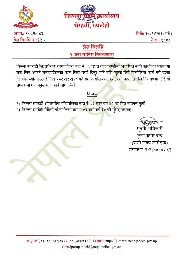 प्रहरीका अनुसार नियन्त्रणमा पर्नेमा रुपन्देहीको ओमसतिया गाउँपालिका–३ का ३२ वर्षीय शिव नारायण कुर्मी र रोहिणी गाउँपालिका–३ का ३० वर्षीय सुरेन्द्र मल्लाह रहेका छन्। उनीहरूले सेवाग्राहीसँग काम छिटो गराइदिने बहानामा बढी रकम लिने गरेको सूचनाका आधारमा आज शुक्रवार खटिएको प्रहरी टोलीले उनीहरूलाई पक्राउ गरेको हो। यस घटनासम्बन्धी थप अनुसन्धान कार्य जारी रहेको प्रहरीले जनाएको छ।