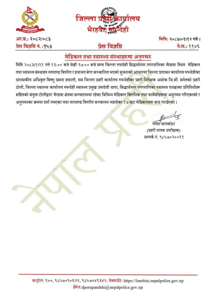 रुपन्देहीको सिद्धार्थनगर नगरपालिका–भैरहवा क्षेत्रमा सञ्चालनमा रहेका मेडिकल तथा स्वास्थ्य संस्थाहरूमा व्यापक अनुगमन गरिएको छ। मापदण्डविपरीत तथा इजाजतबिना सञ्चालन भइरहेको भन्ने सूचनाका आधारमा गरिएको उक्त अनुगमनका क्रममा १७ वटा मेडिकल तथा स्वास्थ्य संस्था बन्द गराइएको जिल्ला प्रहरी कार्यालय रुपन्देहीका प्रहरी नायब उपरीक्षक ९डीएसपी० गणेश सापकोटाले जानकारी दिनुभयो ।