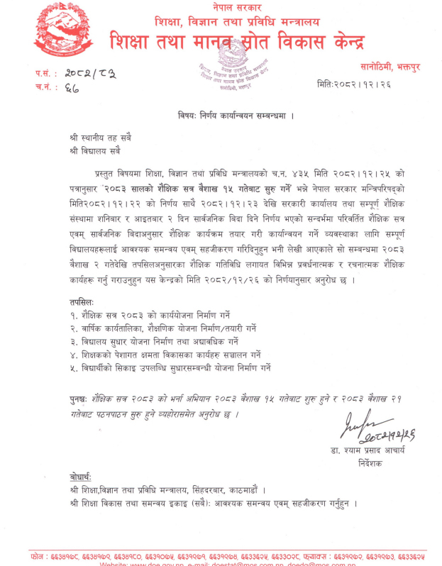 शिक्षा, विज्ञान तथा प्रविधि मन्त्रालय अन्तर्गतको शिक्षा तथा मानव स्रोत विकास केन्द्रले मन्त्रिपरिषद्को चैत २२ गतेको निर्णयका साथै चैत २३ देखि सरकारी कार्यालय तथा सम्पूर्ण शैक्षिक संस्थामा शनिबार र आइतबार दुई दिन सार्वजनिक बिदा दिने निर्णय भएको सन्दर्भमा परिवर्तित शैक्षिक सत्र एवं सार्वजनिक बिदा अनुसार विद्यालयलाई शैक्षिक कार्यक्रम सञ्चालन गर्न अनुरोध गरेको थियो ।