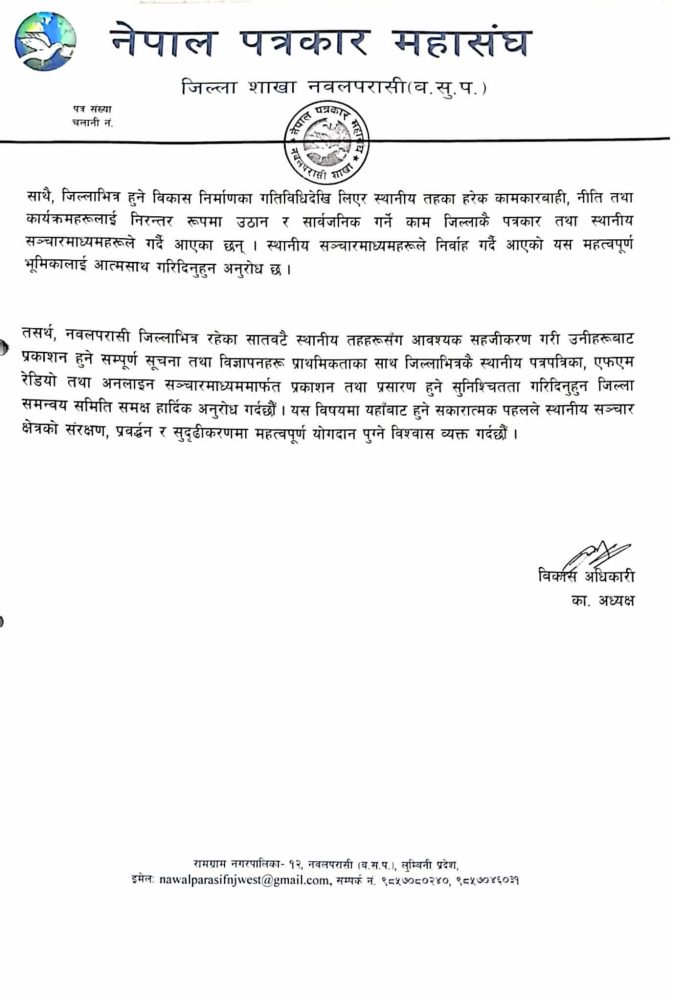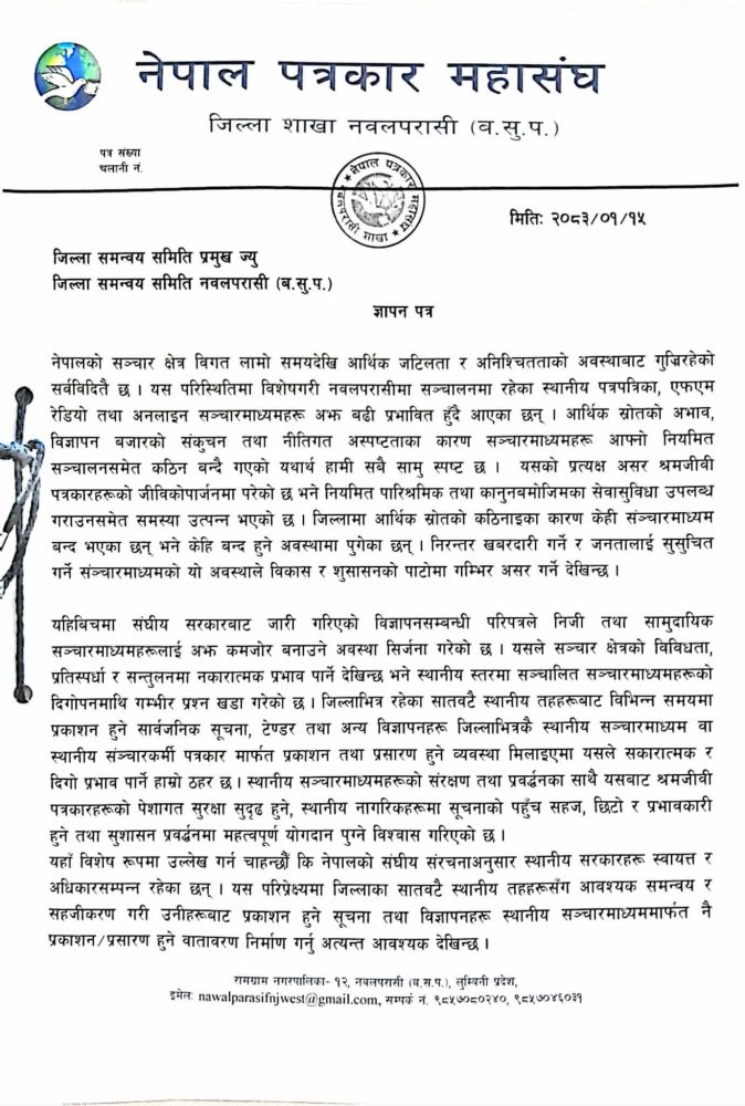 नेपाल पत्रकार महासंघ, जिल्ला शाखा नवलपरासी ले स्थानीय सञ्चारमाध्यमको संरक्षण, प्रवर्द्धन र सुदृढीकरणका लागि जिल्लास्थित स्थानीय तह र सरोकारवाला निकायलाई विज्ञापन तथा सूचनामा प्राथमिकता दिन आग्रह गरेको छ।