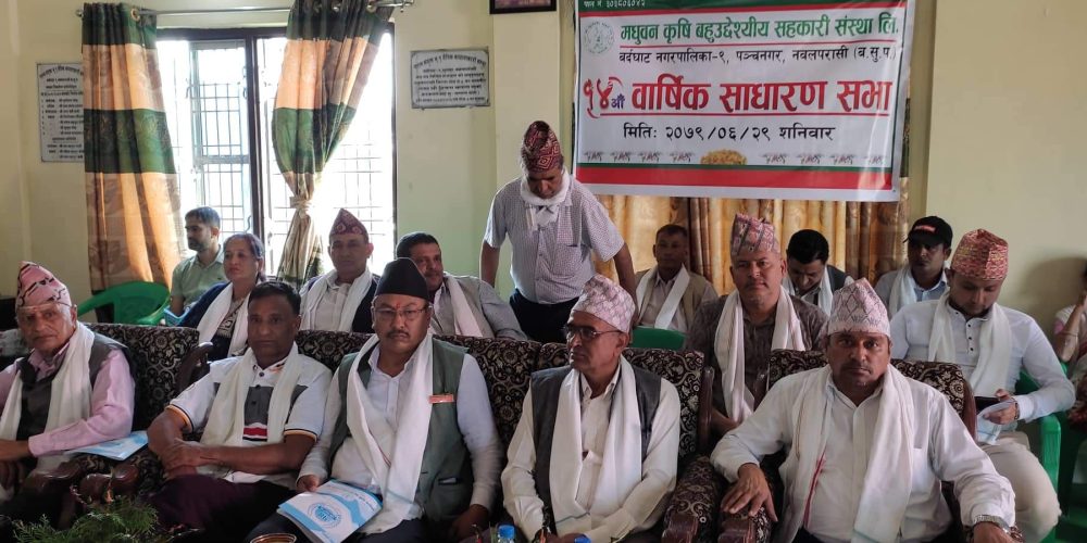 मधुवन कृषि बहुउद्देश्यीय सहकारी संस्था लिमिटेड बर्दघाट ९ पश्चिम् निवलपरासीको १४ औं बार्षिक साधारणसभा शनिबार भुताहामा सम्पन्न भएको छ । सस्थाका अध्यक्ष छबी प्रसाद पौडेलको अध्यक्षता तथा बर्दघाट नगरपालिकाका नगरप्रमुख शम्भुलाल श्रेष्ठको प्रमुख आतिथ्यतामा कार्यक्रम सम्पन्न भएको हो ।