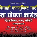 भैरहवा, मंसिर २७ नेपाली कम्युनिष्ट पार्टी सिद्धार्थनगर नगर समितिको आयोजनामा भैरहवामा एकता घोषणा कार्यक्रम सम्पन्न भएको छ । कार्यक्रम नगर समितिका अध्यक्ष नारायण बहादुर हमालको अध्यक्षता तथा महाधिवेशन आयोजक कमिटीका केन्द्रीय सदस्य हक्की कुल्लाह खानको प्रमुख आतिथ्यतामा एकता घोषणा क..